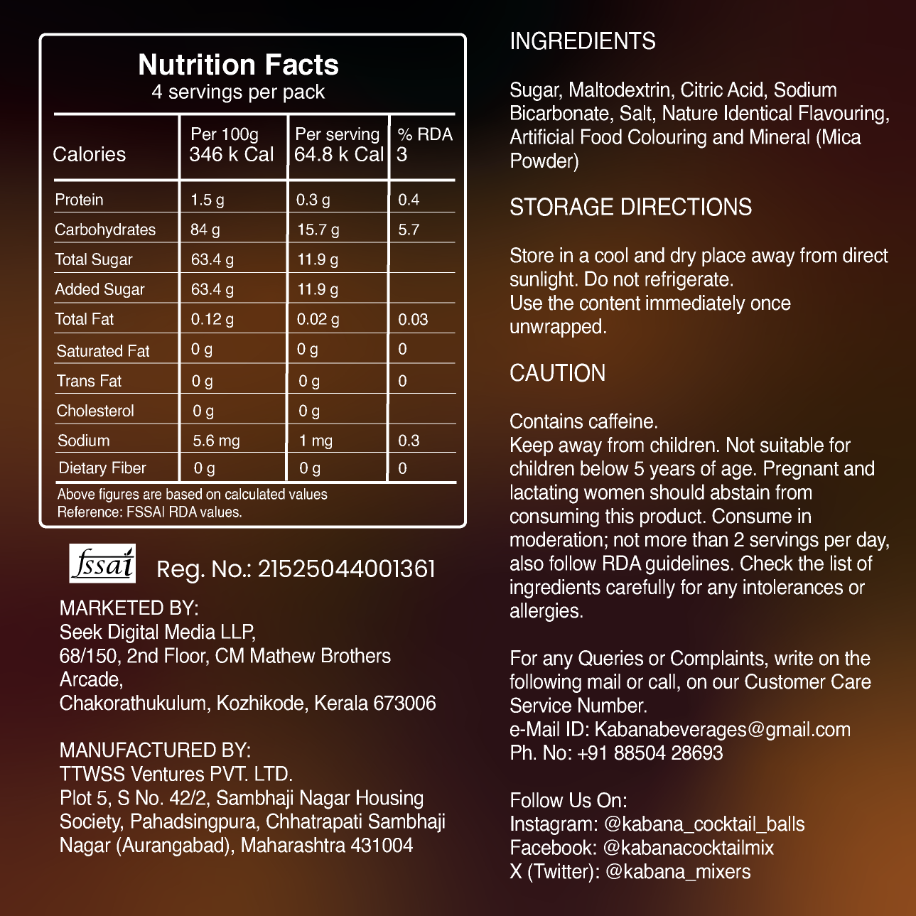 The bold, caffeinated cocktail balls your night needs. Our Espresso Martini sphere delivers the rich, robust flavour of cold-brew coffee with sweet vanilla notes for an instant espresso martini. Just add vodka. This coffee cocktail ball provides a real energy lift, making it the perfect, waste-free way to keep the celebration going. The sparkly nature of the beverage makes it aesthetically pleasing and Instagrammable. Make memories with Kabana balls.
